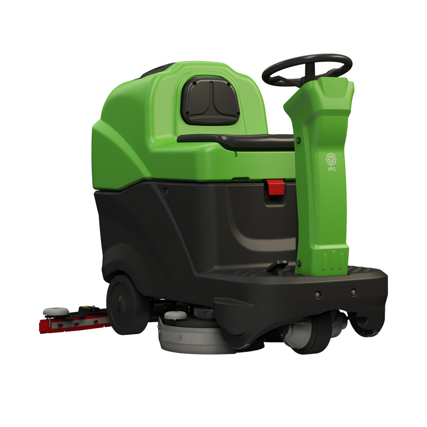 The CT81 is a ride-on scrubber-dryer with a compact design and built with durable materials, designed for cleaning medium-sized areas.
